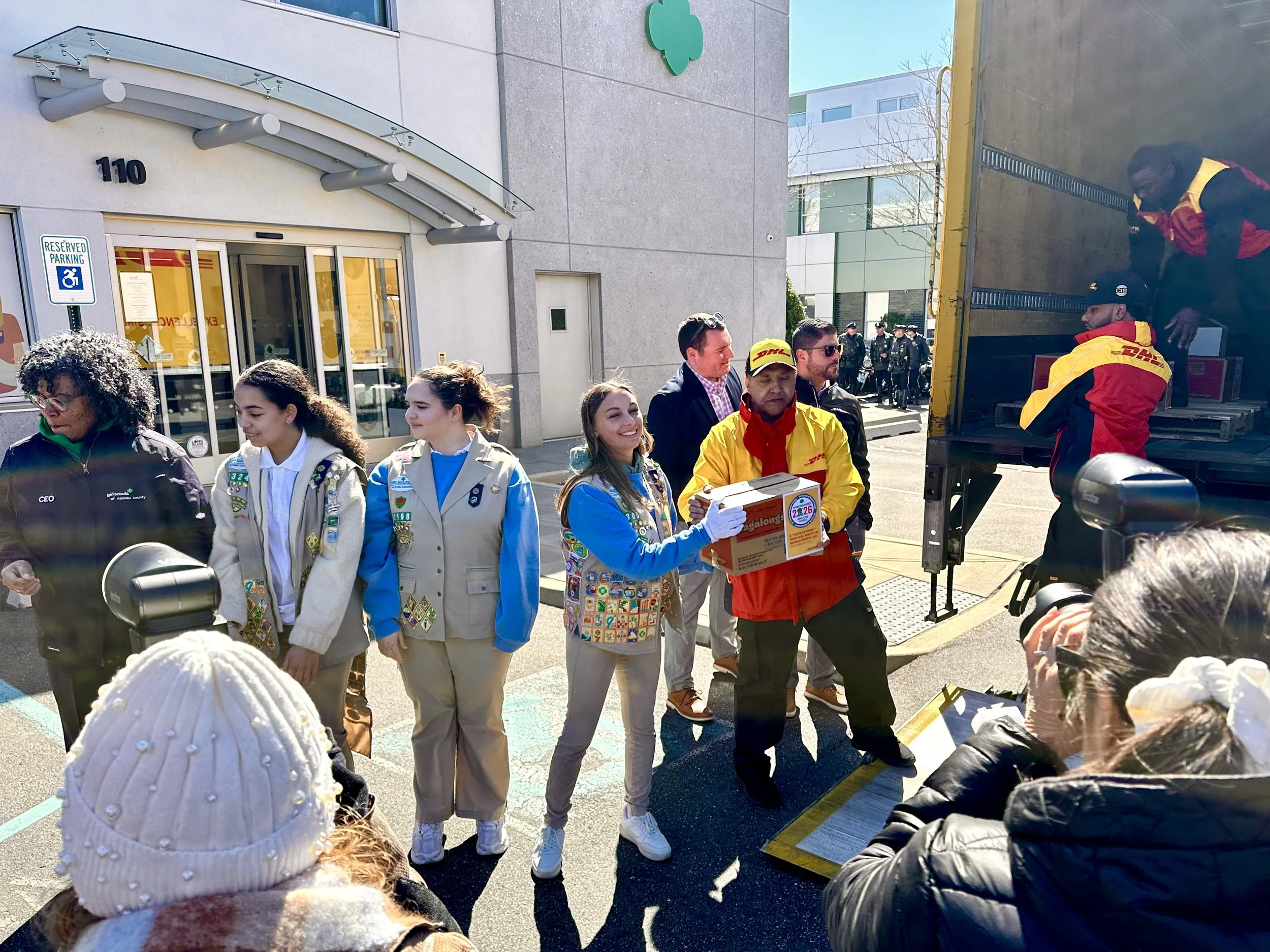 A smiling Girl Scout helps load the DHL truck at Girl Scouts of Nassau County headquarters.